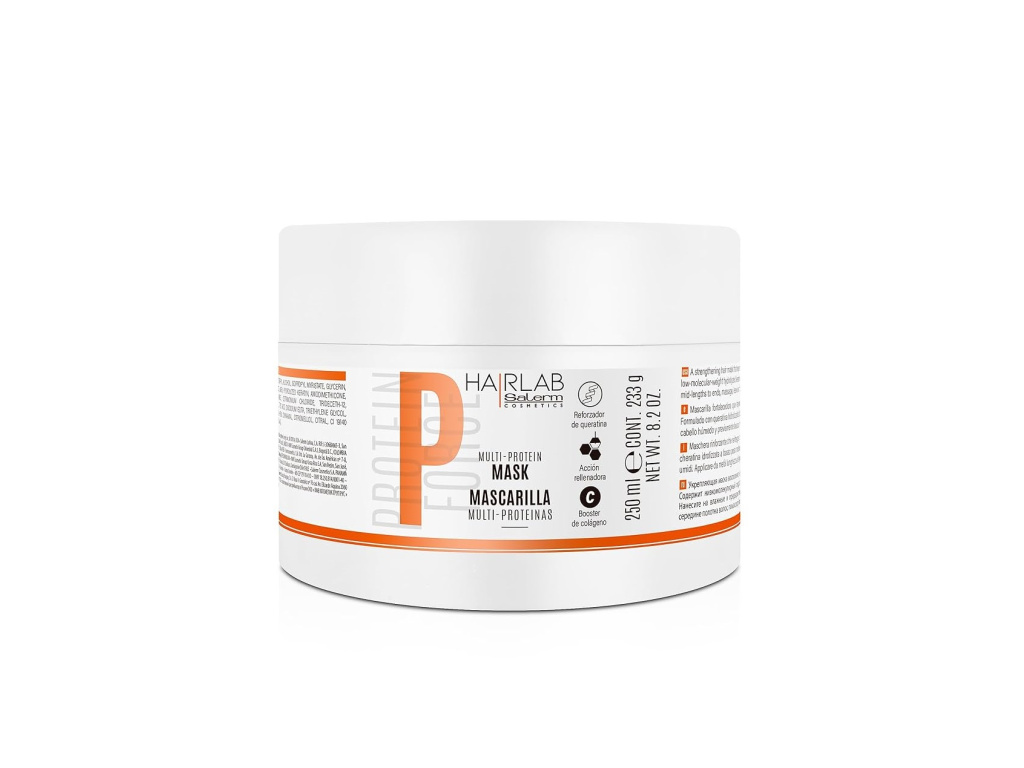 Salerm HAIR LAB Protein Force maska s proteiny (Multi-Protein Mask/Mascarilla Multi-Proteinas) je hloubkové ošetření s okamžitým účinkem, speciálně určené pro poškozené, zničené a suché vlasy. Maska vlasy zjemňuje a usnadňuje jejich rozčesání. Složení masky obnovuje neutrální pH po mytí a technickém ošetření vlasů.